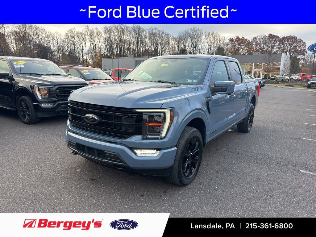 Certified. Azure Gray Metallic 2023 Ford F-150 Platinum 4WD 10-Speed Automatic 3.5L PowerBoost Full-Hybrid V6 1-OWNER, CERTIFIED, ORIGINAL MSRP $77,840, 3.5L PowerBoost Full-Hybrid V6, 4WD, Bed Utility Package, Class IV Trailer Hitch Receiver, Integrated Trailer Brake Controller, Navigation System, Platinum Black Appearance, Power Tailgate, Pro Trailer Backup Assist & Pro Trailer Hitch Assist, Radio: B&O Unleashed Sound System by Bang & Olufsen, Tailgate Step w/Tailgate Work Surface, Trailer Tow Package, Unique Multi-Contour Leather Bucket Seats, Wheels: 20" Gloss Black Painted Aluminum.